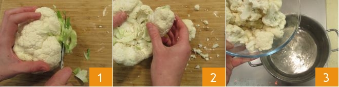 First, wash and clean the cauliflower by removing the outer leaves and central core 1, then detach the florets 2: you should get about 1.75 lbs of cauliflower. Plunge the florets into boiling salted water 3 and boil for 15 minutes (if you don't like the smell of cooking cauliflower, you can reduce it by adding lemon or vinegar to the water).