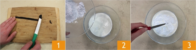 Begin the preparation: first, take care of the vanilla bean: cut it with a small knife, gently open it with your hands, and run the blade of a small knife along the pod to extract the seeds 1. Then pour the cream into a bowl, add the powdered sugar 2, and the vanilla bean seeds 3.
