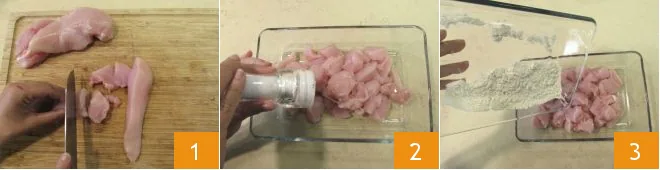 To prepare your chicken bites with yogurt and turmeric, first remove from chicken breast any cartilage and bones and cut it into cubes of equal size 1. Transfer the chicken to a bowl, add salt 2, flour 3 and mix well to coat the meat evenly.