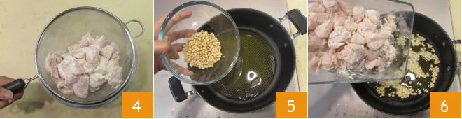 Remove the excess flour with a sieve 4 and cook. Heat the oil in a pan, pour the pine nuts 5 and toast them for a few minutes over high heat 5. When the pine nuts are golden, add the floured chicken nuggets 6, mix and let them brown for a few minutes, always on high heat,