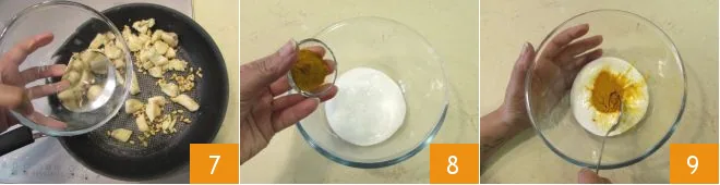 then blend with water 7. Meanwhile, prepare the sauce: add the turmeric to the yogurt in a bowl 8 and mix the mixture well 9.