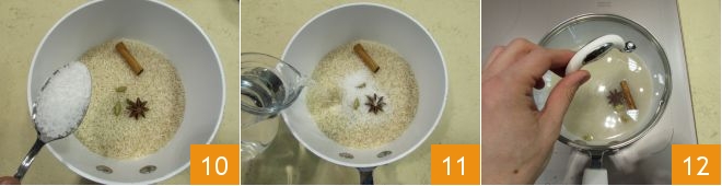 Once the chicken has marinated, start to prepare the rice accompaniment. Rinse the rice well, then pour into a saucepan, add the cinnamon stick, cardamom pods, and star anise. Add the coarse salt 10 and water 11. Cover with a lid 12 and bring to a boil, then lower the heat and leave to cook for 8-10 minutes.