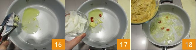 Pour the oil into a pan, crush the garlic into it 16, then add the onion, ginger, and chili 17. Fry lightly over medium heat and then add the chicken, together with all of the marinade 18.