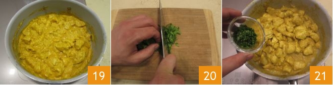 Leave to cook for 8-10 minutes 19 and in the meantime, chop the coriander leaves finely 20; you’ll add them to the pan at the last minute when the chicken is nearly done 21.