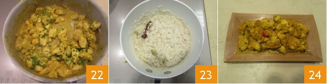 At this point, both the chicken curry 22 and the basmati rice 23 will be ready. Now you just have to serve them 34!