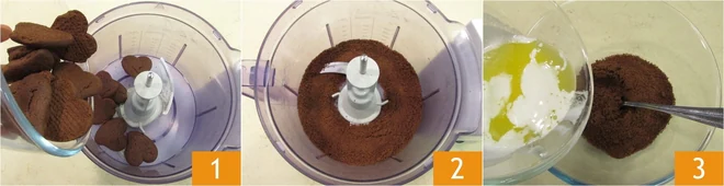 To make the chocolate cheesecake, first prepare the cookie base: melt the butter in a saucepan and let it cool, meanwhile pour the chocolate cookies into a mixer 1 and blend to reduce them to powder 2. Transfer the blended cookies to a bowl and add the melted and cooled butter 3.