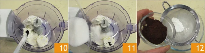 Add the seeds of the vanilla bean 10 and the sugar 11. In a separate bowl, sift the cornstarch with the cocoa 12.