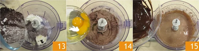 Also add the powders 13 and blend to combine everything. Add the eggs 14 and blend again, then pour in the melted and cooled chocolate 15.