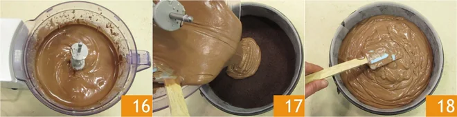 Blend again until you obtain a dense and homogeneous mixture 16. At this point, take the pan with the cookie base and pour the cream inside 17, then level the surface 18. Bake in a preheated static oven at 329°F for 60 minutes, placing a small pot of water in the oven to create the right humidity: this way it is less likely that cracks will form during cooking or setting. Once cooked, remove from the oven and let the cheesecake cool in the pan, then transfer it to the refrigerator for at least 2 hours.