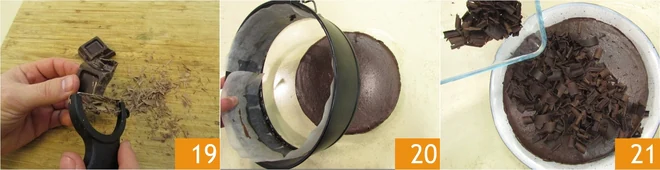 Meanwhile, create the dark chocolate curls for decoration with the help of a potato peeler 19 and keep them cool until ready to use. After the setting time, remove the pan 20 and garnish with the chocolate curls: your chocolate cheesecake is ready to be served 21!