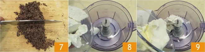 Meanwhile, prepare the cream: chop the dark chocolate with a knife 7 and melt it in a double boiler or microwave, then let it cool. Meanwhile, pour the ricotta 8 and cream cheese 9 into a mixer.