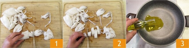 To prepare cuttlefish with peas and bacon, clean the cuttlefish, separate the tentacles 1 and cut them into pieces 2. Pour the oil into a pan 3.