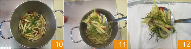 Squeeze the eggplants well, using a dish towel if necessary. Then pour them into the water and vinegar 7, blanch for about 30 seconds, then add the chili pepper 8, garlic, and rosemary 9.