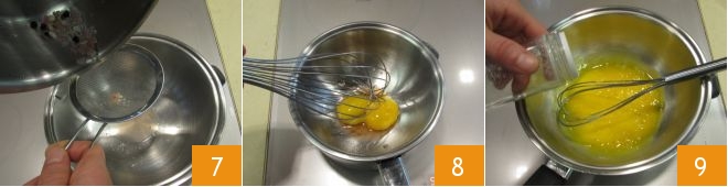 Strain the boiled liquid, transferring it to a double boiler (or set up a classic double boiler if you don't have a saucepan with an integrated double boiler) 7; ensure that the water in the container below never touches the bowl. Also, add the egg yolks to the same saucepan 8 and, using a whisk, beat the mixture constantly over moderate heat. Salt 9 and continue to beat the eggs until they thicken.