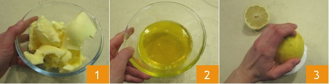To prepare the eggs Benedict, start with the hollandaise sauce. Take the clarified butter 1, melt it in a saucepan or microwave and set it aside 2, then squeeze the half lemon to extract the juice 3.