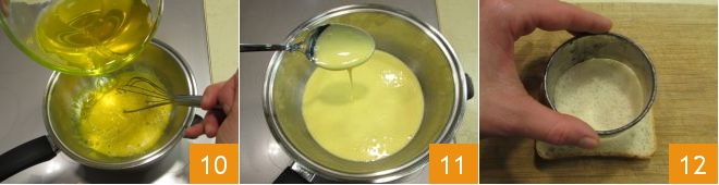 At this point, pour the clarified butter in a thin stream, making sure to keep beating constantly 10, until all the butter is incorporated and the sauce is "whipped" (this operation will take about 6 minutes). At this point, remove the saucepan from the heat and add the lemon juice. Set the sauce aside 11, keeping it warm, or transfer it to a bowl (at room temperature, not in the fridge). Cut discs from the bread slices with a pastry cutter with a diameter of about 2 1/2 inches 12,