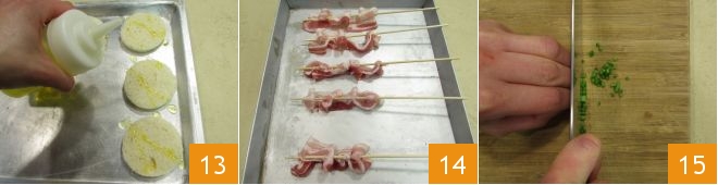 transfer them to a baking sheet and lightly oil the surface 13. Toast the bread in a static oven at 355°F for about 4 minutes until golden. Skewer the bacon slices 14 and pass them in a static oven at 430°F for 5 minutes, so you get crispy and wavy slices. Finally, finely chop the chives 15 and place them in a small bowl.