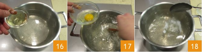 Lastly, dedicate yourself to cooking the eggs, so as to serve them hot. In a pot, pour the water and vinegar 16, heat it up, and in the meantime, crack the egg into a separate small bowl, being careful not to damage the yolk. Once the water has reached boiling, stir with a wooden spoon to create a vortex, into the center of which you will pour the whole egg 17. Wait for the egg to float slightly and, using a spoon, gently wrap the egg white around the egg itself 18.