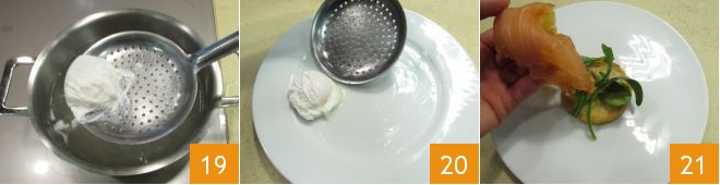 Before removing the egg from the water, wait a couple of minutes. Lift it with a slotted spoon 19, place it on a plate 20, and repeat the same operation for the remaining eggs. Now assemble your eggs Benedict: for the salmon version, place a toasted bread crostino on a plate, lay some mixed greens, place a slice of salmon 21,
