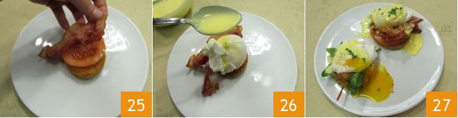 the crispy bacon 25, and finally finish with the hollandaise sauce 26 and season with pepper and chives to taste. Serve your eggs Benedict immediately 27.
