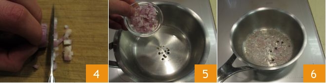 With a smooth-bladed knife, finely chop the shallot 4. In a saucepan, pour the vinegar, water, peppercorns, and shallot 5 and bring the mixture to a boil 6.