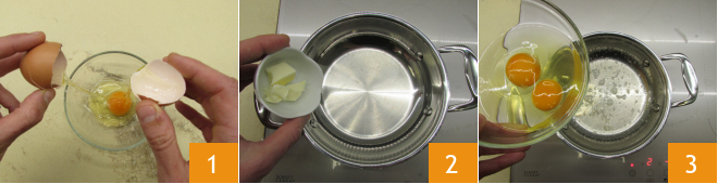 To prepare the fried eggs, start by cracking a couple of room temperature eggs into a bowl 1. Melt the butter in a steel pan 2 and then gently pour in the eggs 3.