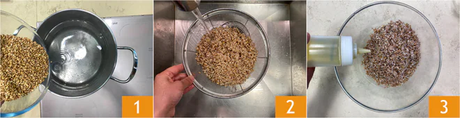 To prepare the farro salad with herb pesto and primosale, bring the spelt to a boil 1 (this instant one will be ready in about 12 minutes), salt at the end of cooking. Drain and rinse with cold water 2, pour into a bowl, and season with a drizzle of oil 3.