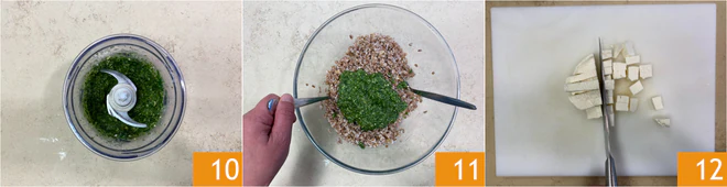 Start the blades to blend everything 10. Pour the pesto into the farro 11 and mix. Cut the primosale into cubes 12.