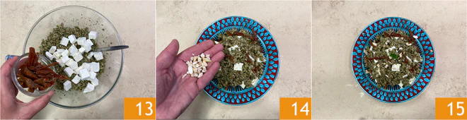 Add the sun-dried tomatoes cut into strips and the primosale 13. Garnish with slightly chopped cashews 14. The farro salad is ready to be enjoyed 15.