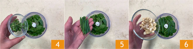 Prepare the pesto by pouring the basil, marjoram 4, chives 5, and cashews 6 into the mixer bowl.