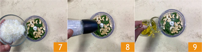 Add the Pecorino 7, salt 8, and pour the oil 9.