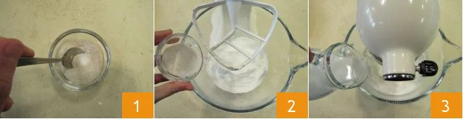 To prepare focaccia, start by stirring the yeast and sugar together in a bowl 1; add them to the bowl of a planetary mixer fitted with a leaf spatula, together with the flour 2. Switch the planetary mixer on, then gradually add the milk and water previously mixed together 3.
