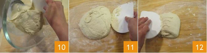 Use a spatula to place it on a work top lightly sprinkled with flour 10 and fold it couple of time, so lift one edge up 11 and bring it to the middle 12. Now lift another edge up and bring it to the middle and repeat once more.