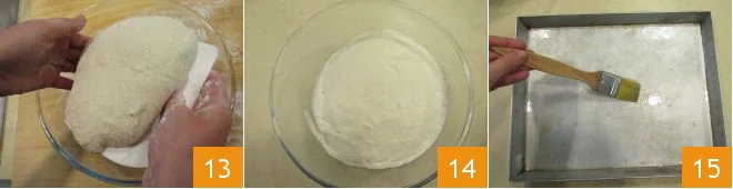 Place the dough in a bowl 13 and cover with plastic wrap. Place the bowl inside a switched off oven with the lights on and leaven for 2 hours, or until it grows to twice its original size 14. Grease a tray (we used a rectangular 14"x11" tray) by thoroughly brushing the entire surface and edges 15,