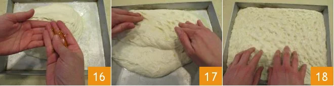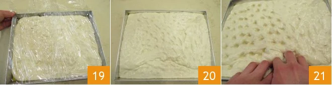 Cover with plastic wrap once finished 19 and leaven for another hour in a switched off oven with the lights on 20. Once the time us up, grease the tips of your fingers with oil and form dimples in the dough 21.