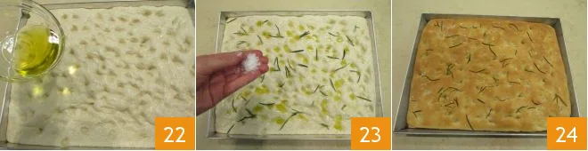 Drizzle with oil 22 and sprinkle with a little rosemary and salt flakes 23. Your focaccia is ready to be baked in a static oven set to 355°F (180°C) for around 35-40 minutes on the lowest shelf (check to see if it is done without opening the oven). Once baked 34, all you need to do is remove it and enjoy it, plain or filled!