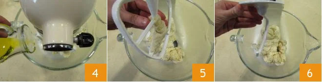 Gradually add the oil too 4. Continue to stir until the batter becomes firmer, then remove the leaf spatula 5 and replace it with a hook stirrer 6.