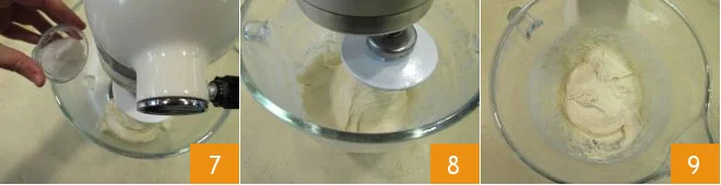 Add the salt 7 and knead for around 15 minutes 8, until the dough is firm and no longer breaks when stretched. The dough is moist so use a spatula to remove it from the hook 9.