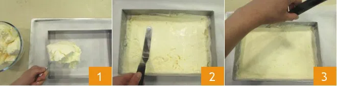 To prepare the gelato bites, start by lining a pan with parchment paper, then place a rectangular cake ring measuring 7x10 inches (17.5x25 cm) and start pouring the ice cream 1; spread it out with a spatula to cover the entire surface and create a thickness of about 0.5 inch (1 cm) 2. Put the ice cream to harden in the freezer for at least 2 hours. Then take the ice cream out, and use a knife around the edges to detach the ice cream 3,