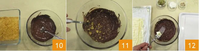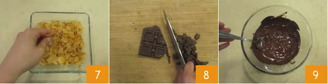 After this time, crumble the corn flakes 7 and chop the dark chocolate 8. Melt the chocolate in a bain-marie (be careful that the water in the bain-marie does not mix with the melting chocolate) or in the microwave 9. Once melted, let it cool, stirring occasionally. In the meantime, place a tray lined with parchment paper in the freezer.