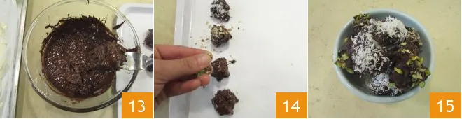 Make sure you dip the ice cream cubes entirely. Remove the excess chocolate 13 and place the bites on the tray cooled and lined with parchment paper, and decorated with chopped hazelnuts, pistachios or coconut flakes 14. Place your gelato bites back in the freezer and take them out when ready to enjoy them 15!