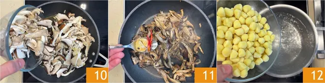 Add the mushrooms 10 and sauté over high heat, adjusting with salt; it will take about 10 minutes. As soon as they form a crust, remove them from the heat, discard the garlic and chili pepper 11, and set aside. Cook the gnocchi in salted boiling water 12.