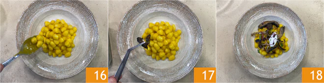 Plate the gnocchi 16 and add the sautéed mushrooms 17, then finish with a ricotta quenelle. Garnish with sprouts and pumpkin seeds and serve your gnocchi with pumpkin cream, mushrooms, and ricotta immediately 18!