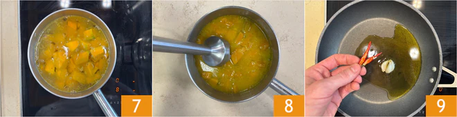 When the pumpkin is soft 7, remove from heat and blend with an immersion mixer to obtain a smooth and velvety puree 8. Set aside the pumpkin cream and proceed to cook the mushrooms: pour a drizzle of oil into a pan and brown a clove of garlic and some chili pepper cut in half 9.