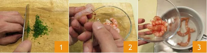Prepare the panettone fillings starting from the shrimp stuffing: finely chop the chives 1, peel the shrimps 2 and boil them in abundant salted water 3 for 2-3 minutes.