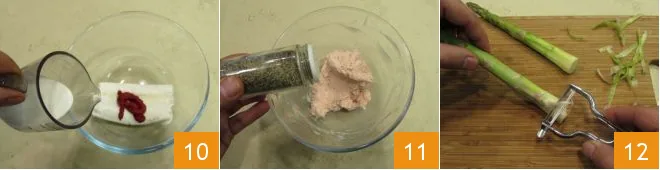 Prepare the goat cheese: place the cheese in a bowl with the milk, add the tomato paste 10, salt and pepper 11, then stir to amalgamate the sauce; leave in the refrigerator. Lastly, prepare the asparagus stuffing: wash the asparagus and remove the toughest and stringiest green part using a potato peeler 12.