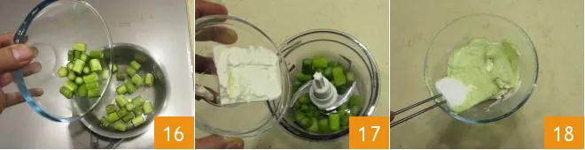 Blanche the rest of the asparagus separately for longer: it will take around 5 minutes 16, Drain and place in a mixer, add the robiola cheese 17, salt and pepper, stir to amalgamate the cream 18, place back in the refrigerator with the other condiments.