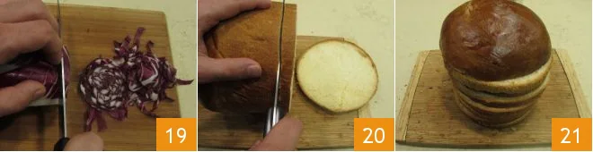 Wash and cut the radicchio into strips 19, then take the panettone and cut it horizontally to obtain 8 discs that are the same thickness, and the cap (20-21).