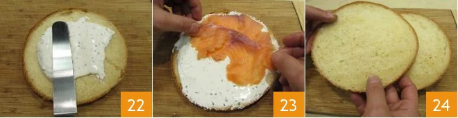 Everything is ready to put your gourmet panettone together: use the first discs as a base, spread the chive cream over it 22 and arrange the smoked salmon slices onto it 23. Add two discs of panettone 34