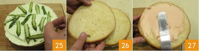 filled with the asparagus cream and arrange the asparagus tips over the surface 25; continue by adding two more discs 26, filled with the tomato cream 27,